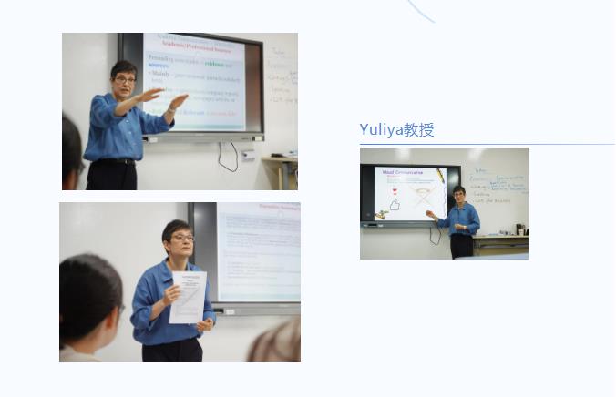 11点55分,大家整齐地坐在教室里等待Yuliya教授的到来。风趣幽默的女教授毕业于英国剑桥大学,本次课程的名称是Academic Communication。课程共分为三部分,第一部分为Academic Writing,第二部分为Academic Presentation,最后一部分为Learning to communicate in an academic and business environment。