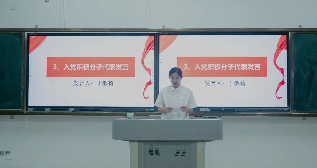 大会第三项:丁敏莉同学代表入党积极分子发言。首先,她介绍了中国共产党已经走过了百年光荣的发展历程,这百年里,中国共产党从小到大、从弱到强、从幼稚到成熟不断发展壮大。接着,她便以自身实际表明了对党的认识和体会不断加深,作为一名新时代的中国青年,要努力奋斗,增强学习紧迫感,孜孜不倦的学习,在党的哺育下茁壮成长,时刻以共产党员的标准严格要求自己。