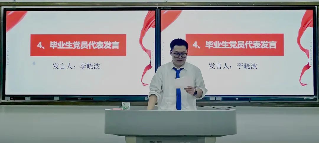 大会第四项:毕业生党员李晓波代表发言。他以当代青年要立足新时代新征程,要坚定不移听党话、跟党走,踏着时代节拍要答好“五卷”,其中分别介绍了时代新人如何用自己的奋斗和青春来谱写中华民族伟大复兴的光辉乐章。我们要与周边的青年结交朋友,做好传帮带的作用。