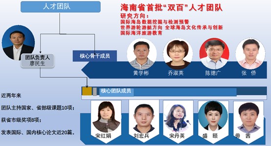 据悉海南省旅游人才团队共有成员10名,其中7名成员具有博士学位,6名成员被认定为海南省拔尖及以上人才等级,三分之一的成员有海外学习经历,成员分别毕业于南开大学、北京大学、清华大学、西班牙胡安卡洛斯国王大学等世界知名大学。成员学科专业涉及经济学、法学、教育学、文学、理学、工学、农学、管理学8个学科。