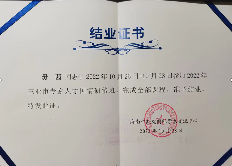 公司毋茜老师参加三亚市举办2022年专家人才国情研修班